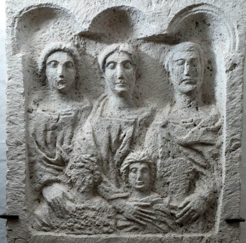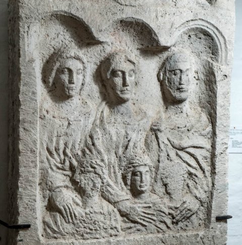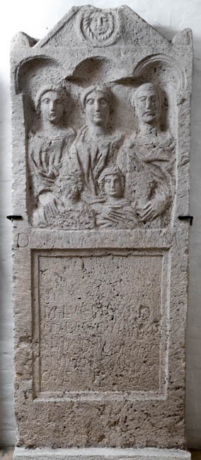 Im Hauptbild Familie: unter drei Bögen Brustbilder von drei Erwachsenen und drei Kindern. Links Frau: offenes Haar (?), Ärmeltunica. In der Mitte Frau: Mittelscheitel, Ärmeltunica. Rechts Mann: bärtig, Sagum. Vor den Frauen zwei Mädchen, vor dem Mann Knabe. - Inschrift
