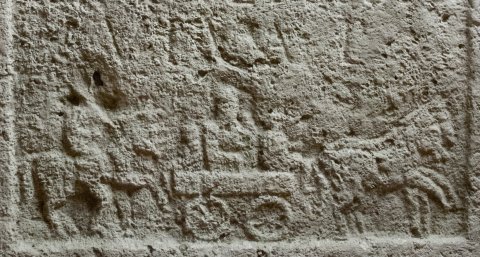 - Im Hauptbild zwischen Säulen drei Brustbilder einer Familie. Links Frau, rechts Mann, vorn Kind. Unterhalb der Inschrift Wagenszene: vierrädriger offener Wagen mit Zweigespann, Kutscher, zwei Fahrgästen auf Lehnstuhl, rückwärts Diener. Hinter dem Wagen Reiter.