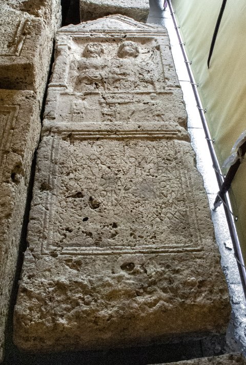 - Giebel mit Gorgoneion. Im Hauptbild zwischen Pilastern zwei Halbfiguren (Ehepaar). Links einheimische Frau: Haube, Umhang, Gürtel, Fibeln. Rechts Mann: bartlos (?). gesträhntes Haar, Paenula, in der Linken Zange (?). Zwischenbild mit Totenopfer: dreibeiniger Tisch mit Gefäßen, links Dienerin, rechts Diener.