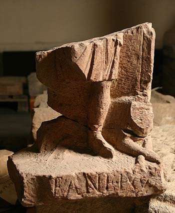 - 0ben und links abgebr., nur linker Unterschenkel und Teil des Gewandes sowie Körper des Hundes erhalten