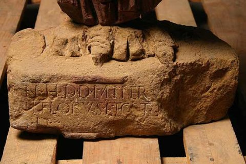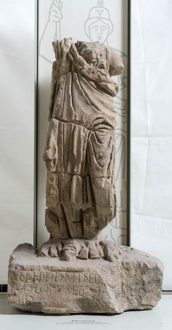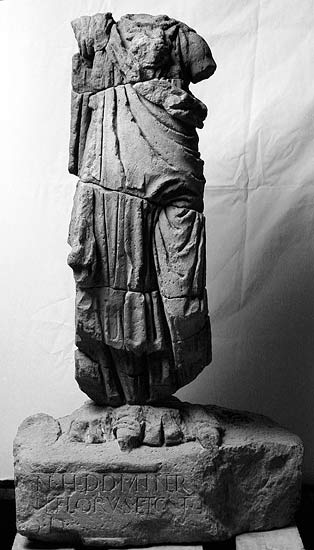 - Mythische Figur (Minerva) : stehende Göttin in Chiton und Mantel, auf der Brust Spuren des Gorgoneions, rechter Arm war erhoben;