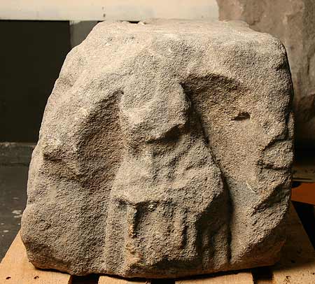 - Eckblock: auf der Vorderseite drei bekleidete Brustbilder (Reste von stehenden Ganzfiguren ?). Auf der linken Nebenseite Attisfigur (?).