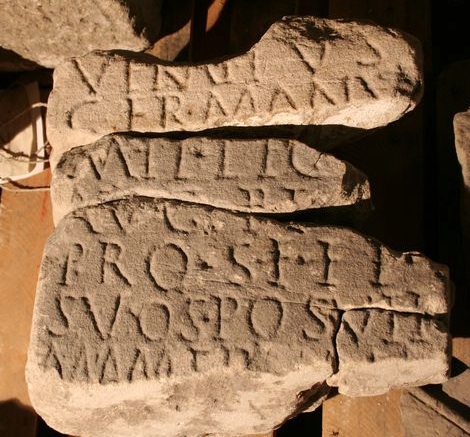 - ---] / [Vengius] / [Germanus] / mil(es) leg(ionis) [VIII] / Aug(ustae) b(ene)f(iciarius) [co(n)s(ularis)] / pro se et / suos(!) posuit / Mamert[ino] / [et Rufo co(n)s(ulibus)]