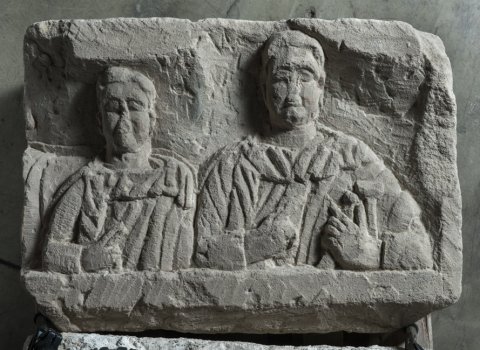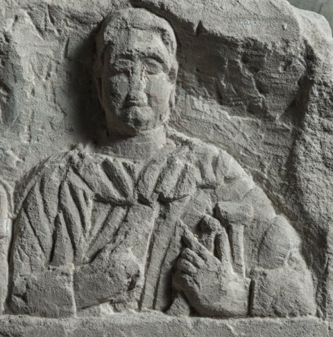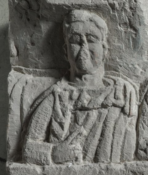 - Familie: in Nische mit Doppelbogen Brustbilder eines Ehepaares mit Kind. Links Frau (?), nur Hand und linke Schulter erhalten. In der Mitte Knabe in Ärmeltunica, Sagum, Fibel. Rechts Mann (Soldat): bartlos, Ärmeltunica, Sagum, Bügelfibel, in der Linken Rolle (volumen). Waffen: im linken Arm Schwert.