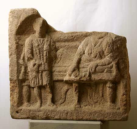 - Totenmahl : Der auf einer Kline liegende, mit einer Toga bekleidete Mann greift mit der Rechten zum Essen, das auf einem kleinen Tischchen bereitsteht. Links des Tisches hält ein Diener in der rechten Hand eine Kanne und über der linken Schulter ein Tuch (mappa).