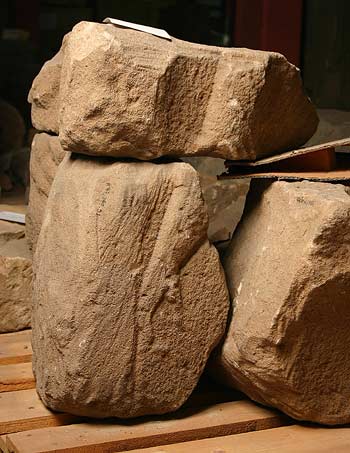 - Eckblock: auf der Vorderseite rechts auf Felsgrund sitzende, nach links gewandte nackte männliche Figur (Mythos ? Polyphem ?). Auf der rechten Seite herabhängender rechter Arm einer nach links gehenden Figur.