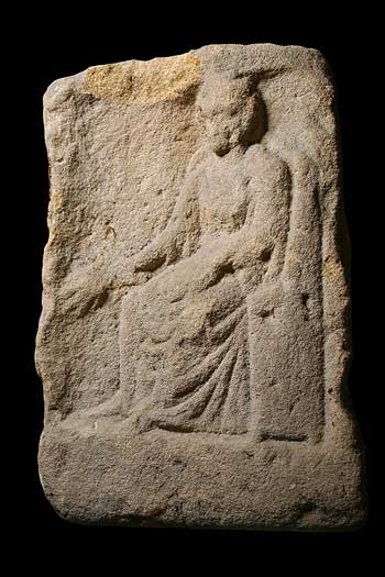 - Nach links hin sitzende bekleidete Frau auf einem Lehnstuhl, die Linke hält eine Schale auf den Knien (?), in der Rechten Zweig ?