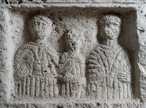 Im Hauptbild Familie: in Rechtecknische Halbfiguren eines Ehepaares mit Kind. Links Frau, in der Mitte Kind, rechts Mann: bärtig, Paenula (?). - Inschrift