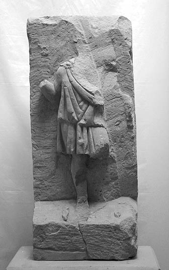 - Mythische Figur (Diana ?) : ungerahmte Platte mit vorspringender Standleiste. Stehende weibliche (?) Figur in kurzem Chiton und auf der rechten Schulter geschlossenem Mantel. Neben dem rechten Fuß Reliefrest von einem Tier (?).