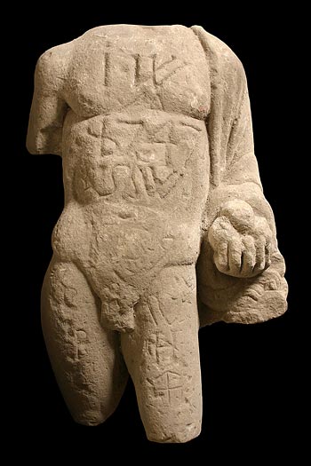 - Kopf, rechter Arm u. beide Unterschenkel abgebr., auf Torso u. Oberschenkeln rezente Schriftzeichen