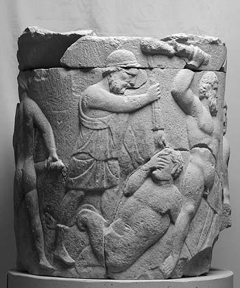 Vulcanus: Bärtig mit knielangem gegürtetem Gewand, das die rechte Schulter frei lässt. Auf dem Kopf eine halbkugelige Kappe, aus der eine Flamme emporzüngelt. Er blendet mit der Fackel einen vor ihm umgesunkenen Giganten.