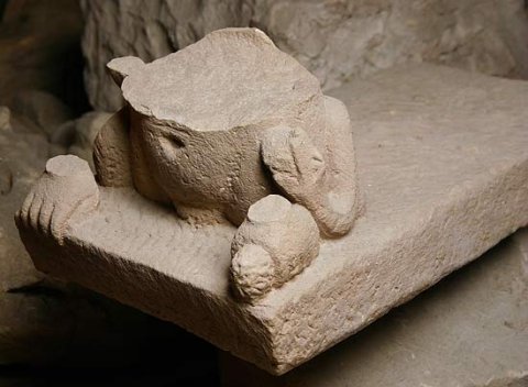 - Mythische Figur : rechteckige flache Basisplatte, darauf an einer Schmalseite Unterleib mit Schlangebeinen und aufgestützte Hände des Giganten. In der rechten Faust Stein.