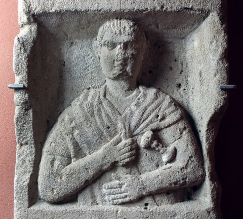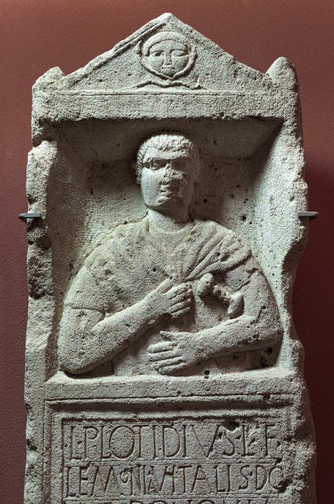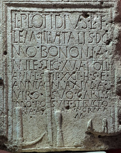 Lucius Plotidius, der Sohn des Lucius, aus der Tribus Lemonia, Heimatort Bononia, Soldat der 15 Legion Apolinaris, 50 Jahre alt, 23 Dienstjahre, liegt hier begraben. Annia Maxima hat ihrem liebsten Mann Bauwerkzeuge, Axt und Winkelmaß (auf den Grabstein) gesetzt.