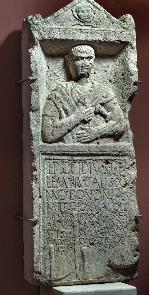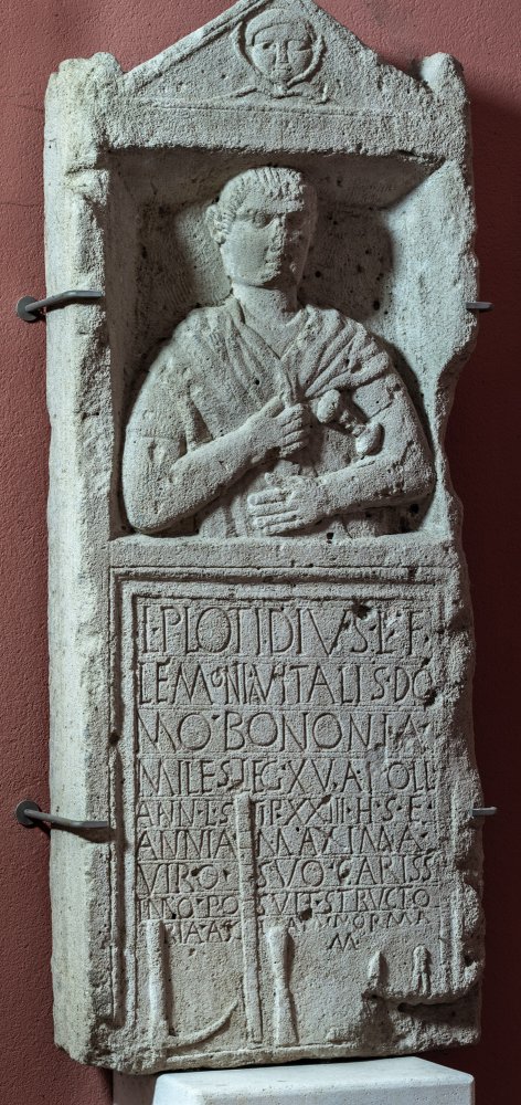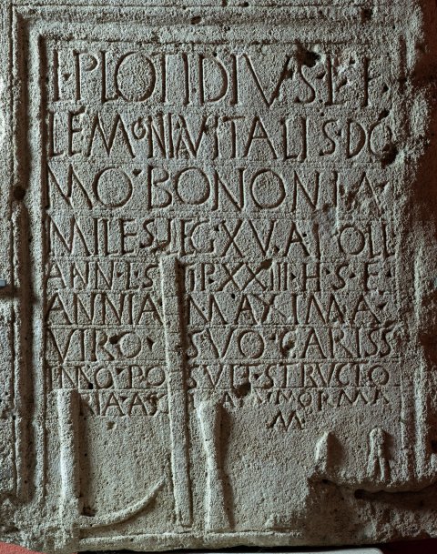 - L(ucius) Plotidius L(uci) f(ilius) / Lemonia Vitalis do/mo Bononia / miles leg(ionis) XV Apoll(inaris) / ann(orum) L stip(endiorum) XXIII h(ic) s(itus) e(st) / Annia Maxima / viro suo cariss/imo posuit structo/ria asciam norma/m