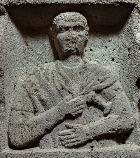 Im Hauptbild Mann (Soldat). In Rechtecknische Halbfigur: bartlos, gesträhntes Haar, Tunica, Paenula. Waffen: im linken Arm Schwert.