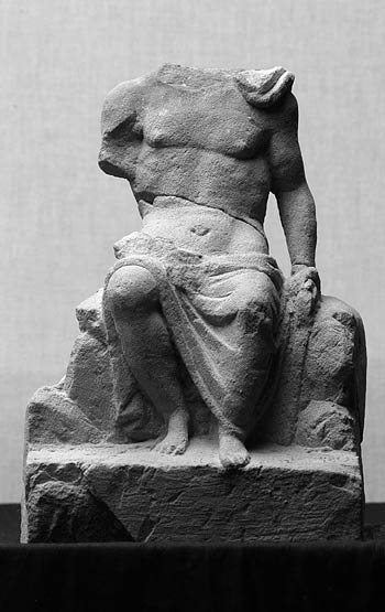 - mythische Figur : Gott (Jupiter ?), Mantel um den Unterkörper gelegt, auf Felsensitz ?