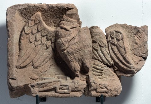 - Aus drei größeren Stücken zusammengesetzt, es fehlt fast das ganze rechte obere Viertel einschließlich des größeren Teiles des Adlerkopfes.
