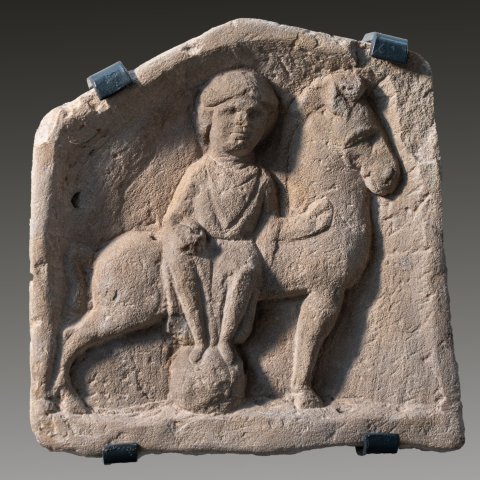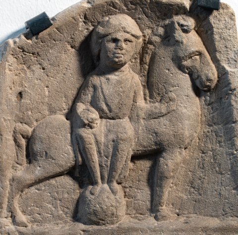 Mythische Figur: Das gerahmte Bildfeld hat einen ungleichmäßigen, annähernd dreieckigen Giebel. Epona sitzt, frontal zum Betrachter, im Damensitz auf einem kräftigen Pferd mit kurzer, aufgestellter Mähne, das mit fest auf die Erde gestemmten Vorderbeinen und weit nach hinten gestreckten Hinterbeinen steht. Epona hat die Füße auf eine halbrunde Stütze gestellt, während sie mit der Rechten ein rundes Objekt auf dem Knie hält und die Linke zum Pferdehals streckt. Sie trägt ein gegürtetes Gewand, dessen Faltenwurf durch eine V-förmige Kerbe am Oberkörper nur angedeutet wird, und das ihre Beine vor dem Hintergrund einer Satteldecke sichtbar werden läßt;