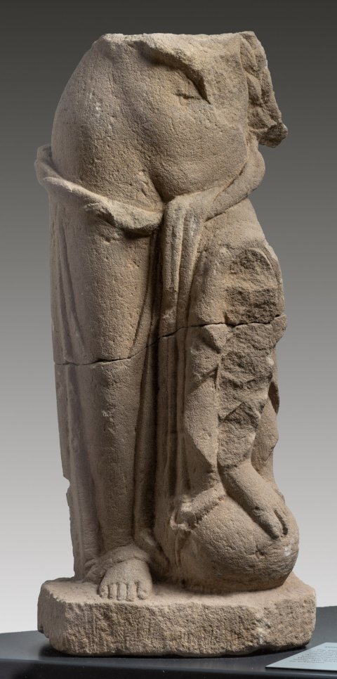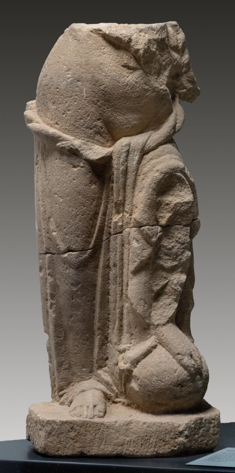 - In der Hüfte eine Handbreit über dem Nabel abgebrochen. Bestoßungen auf der linken Bauchseite und am Schild.