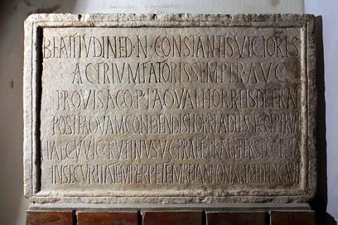 - Beatitudine d(omini) n(ostri) Constantis victoris / ac triumfatoris semper Aug(usti) / provisa copia quae horreis deerat / postea quam condendis horrea deesse coeperunt / haec Vulc(atius) Rufinus v(ir) c(larissimus) praef(ectus) praet(oriae) per se coepta / in securitatem perpetem(!) rei annonariae dedicavit