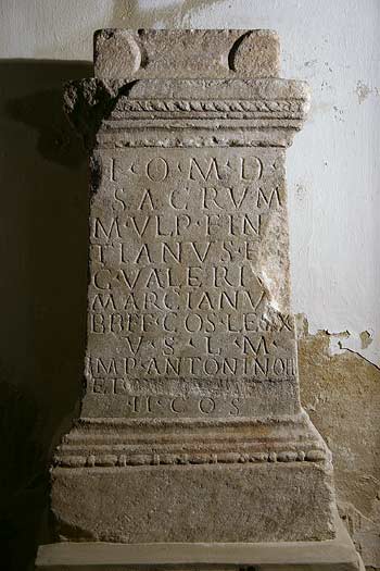 - I(ovi) O(ptimo) M(aximo) D(olicheno) / sacrum / M(arcus) Ulp(ius) Fini/tianus e[t] / G(aius!) Valeriu[s] / Marcianu[s] / bb(ene)ff(iciarii) co(n)s(ularis) leg(ionis) X G(eminae) / v(otum) s(olverunt) l(ibentes) m(erito) / Imp(eratore) Antonino II / et [[[Geta Caesare]]] / II co(n)s(ulibus)