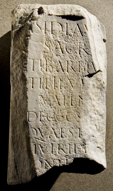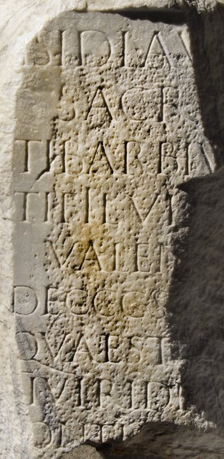 - Isidi Au[g(ustae)] / sacr(um) / Ti(berius) Barbiu[s] / Ti(beri) fil(ius) Ve[l(ina)] / Valen[s] / dec(urio) c(oloniae) C(laudiae) S[av(ariae)] / quaest[or] / IIvir i(ure) di[c(undo)] / [p]onti[fex] / [---