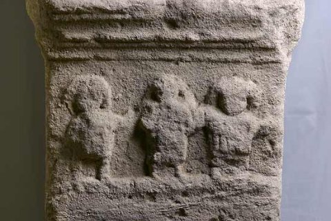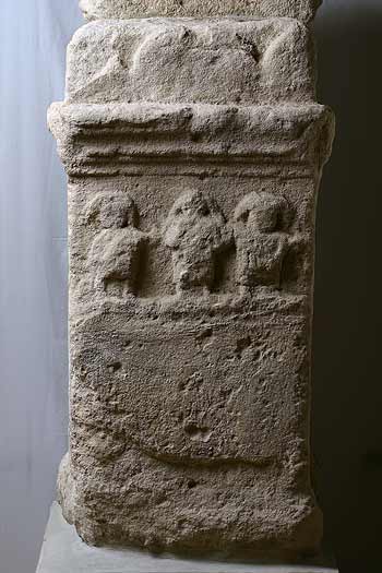 - Mythische Figuren (Fatae ?) : Auf der Vorderseite des Schaftes oben querrechteckiges Bildfeld, darin drei frontal stehende Frauenfiguren mit Schleier und halblangem Kleid.