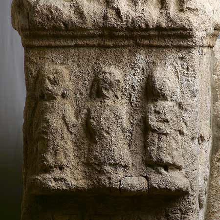 - Auf dem Schaft oberhalb der Inschrift auf vorspringender Leiste drei frontal stehende bekleidete Frauenfiguren mit Schleier. Auf den Nebenseiten Gefäße (links Patera, rechts Kanne).