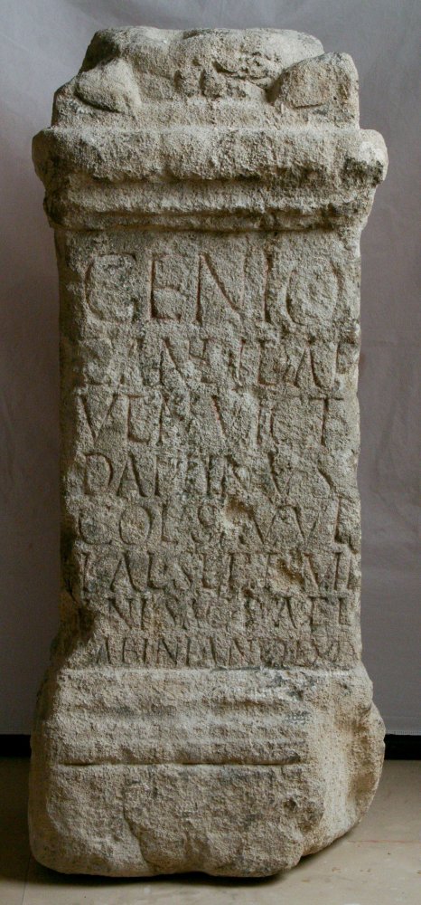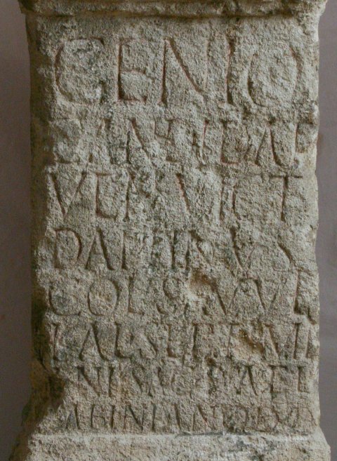- Genio / candidat(orum) / Ven(eri) Vict(rici) / Daphnus / col(oniae) Sav(ariae) vil(icus) / kal(endarii) Septimi/ani sac(erdote) P(ublio) Ael(io) / Sabiniano d(onum) d(edit)
