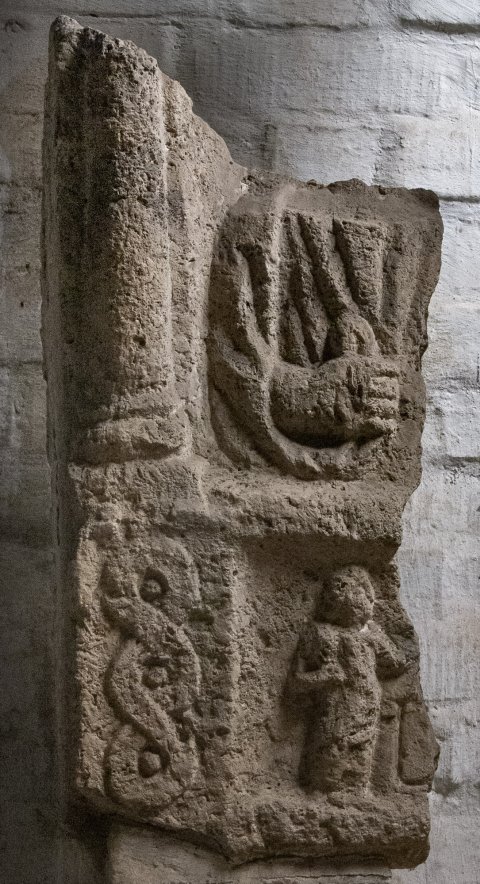 Im Zwischenbild Totenopfer: Dienerin (Rest abgebrochen), auf der seitl. Rahmenleiste Flechtband. - Inschrift