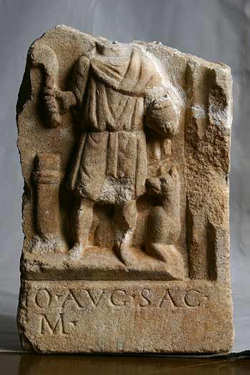 - Mythische Figur : rechts stehender Silvanus in kurzer Tunica und Mantel, in der Rechten Winzermesser, in der Linken Gefäß. Hinter dem linken Bein liegender Hund, neben dem rechten Bein Altar. Auf der anderen Seite des Altars muss eine weitere Figur gestanden sein.