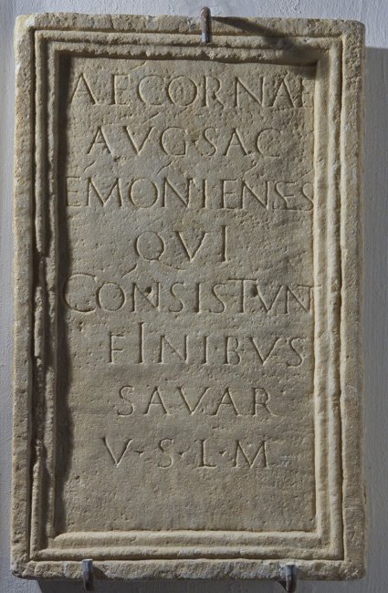 - Aecornae / Aug(ustae) sac(rum) / Emonienses / qui / consistunt / finibus / Savar(iae) / v(otum) s(olverunt) l(ibentes) m(erito)