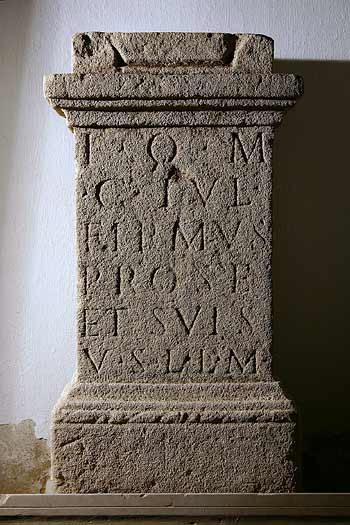 - I(ovi) o(ptimo) m(aximo) / C(aius) Iul(ius) / Firmus / pro se / et suis / v(otum) s(olvit) l(ibens) l(aetus) m(erito)