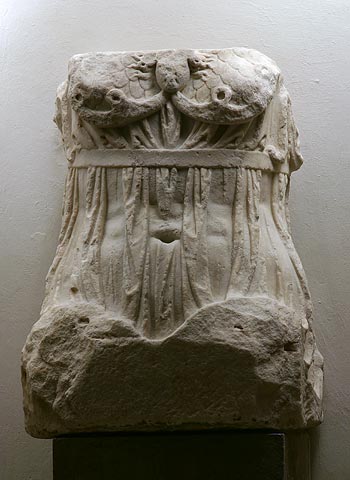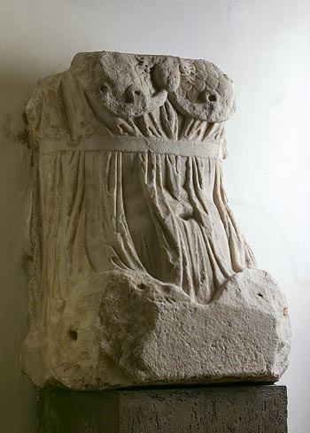 - Mythische Figur : Rumpf einer Sitzstatue mit Ansatz der Oberschenkel, bekleidet mit hochgegürtetem Chiton und Ägis mit Gorgoneion. Minerva der capitolinischen Trias von Savaria (Nr. 7978, 7979).