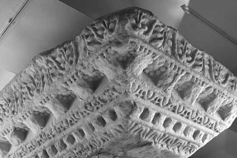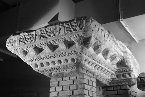 - Vermutlich vom Kapitols-Tempel: an drei Seiten umlaufendes Profil mit Blattstäben, Zahnschnitt, Konsolfries. Oberer Abschluss Palmettenfries.