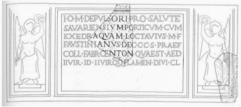 - [I(ovi) O(ptimo) M(aximo) Depu]lsori p[ro salute] / [Savarie]nsium po[rticum cum] / [exed]ra quam L(ucius) O[ctavius M(arci) f(ilius)] / [Fausti]nianus de[c(urio) c(oloniae) Cl(audiae) Savar(iensium) praef(ectus)] / [coll(egii) fabr(um)] centon(ariorum) [aedilicius] / [IIvir i(ure) d(icundo) IIvir q(uin)]q(uennalis) fl[amen col(oniae)] / [---