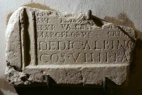 - ---] / Tere(ntius) [---] / Aur(elius) Felix [---] / Sex(a)r(ius)(?) Valentius / Marc(ius) Florus // ---] / AV[---] / CRII[---] // dedic(ata) Albino [et Aemiliano] / co(n)s(ulibus) VIIII Ka[l(endas) ---]