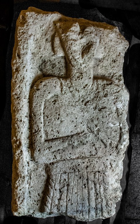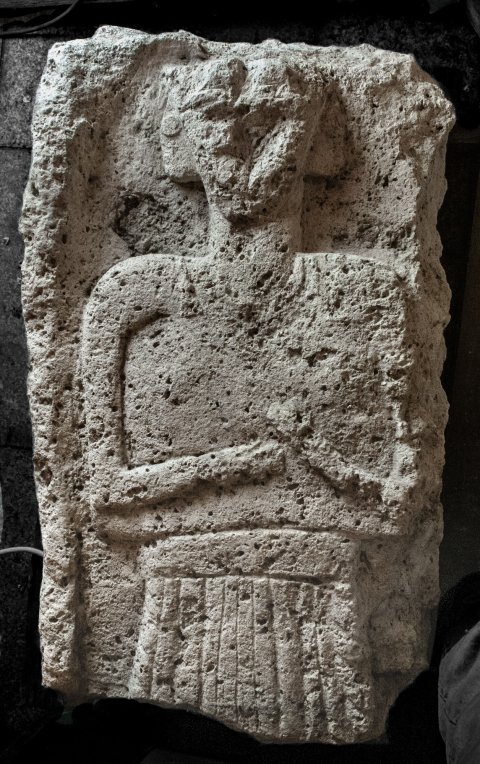 - Einheimische Frau: in Bogennische frontal stehende Ganzfigur mit Fibeln, Halsreif, Halskette, Gürtel.