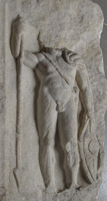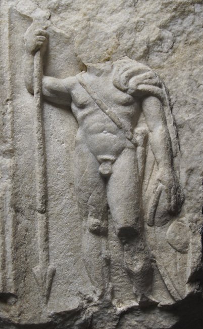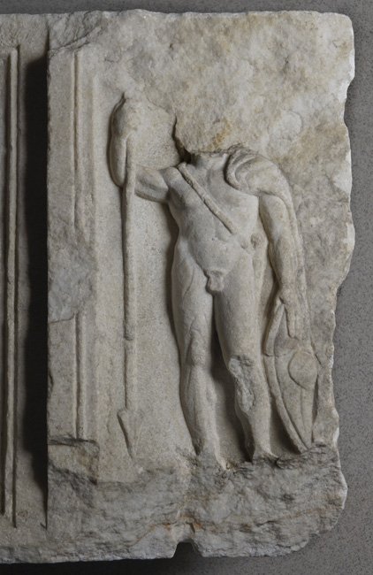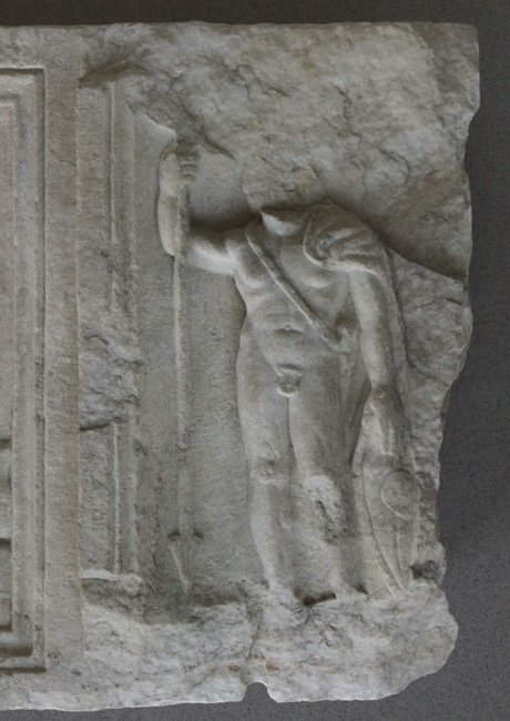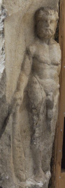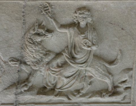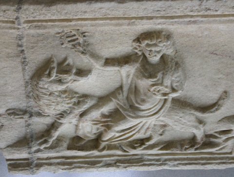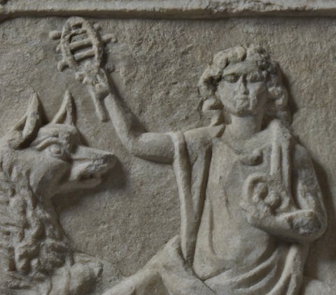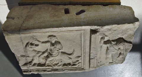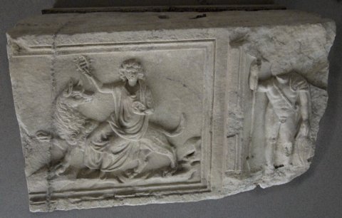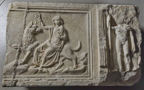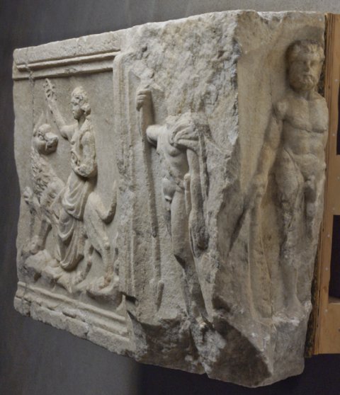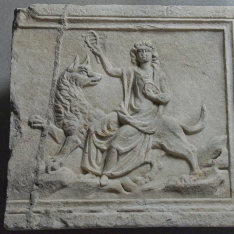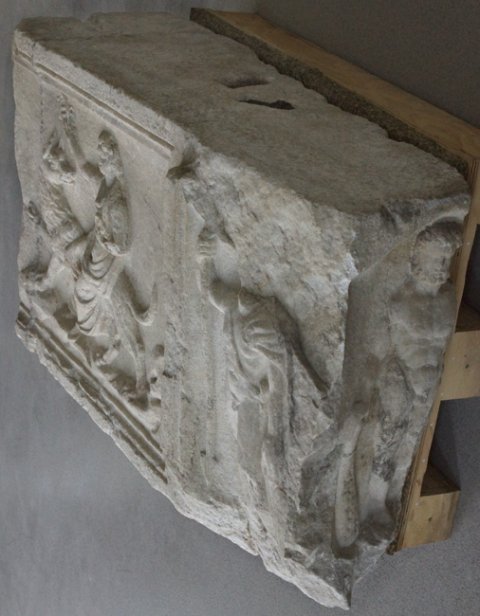 - Mythische Figuren, Musikinstrument: Auf der Längsseite gerahmtes Rechteckfeld, darin Isis in Chiton und Mantel auf dem Sothis-Hund, in der erhobenen Rechten Sistrum, in der Linken Schale mit Früchten. Der Hund läuft über Felsgrund nach links. Rechts anschließend gerahmtes Seitenfeld mit stehendem Mars, in der Rechten Lanze, Schwertgurt über die Brust, Mantel auf der linken Schulter, die gesenkte Linke auf dem ovalen Schild. Auf der rechten Nebenseite giebelförmig gerahmtes Feld mit nacktem, bärtigem Hercules, die Rechte auf Keule gestützt.