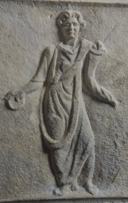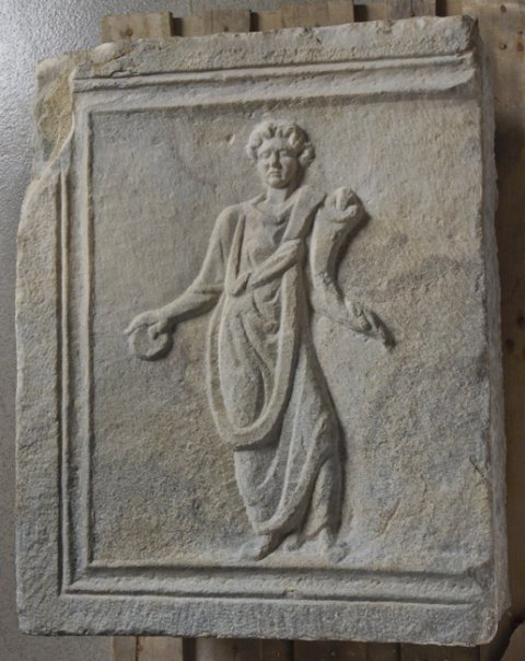 - Mythische Figur : linke Hälfte eines gerahmten Rechteckfeldes, darin stehende Fortuna in Chiton und Mantel, im linken Arm Füllhorn, in der Rechten Schale (patera). Linker Teil des Reliefs Nr. 8007 ?