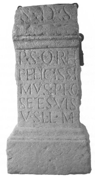 - S(ilvano) D(omestico) s(acrum) // p(ro) s(alute) Q(uinti) R(---) H(---) / Felicissi/mus pro / se et suis / v(otum) s(olvit) l(ibens) l(aetus) m(erito)
