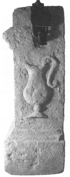 - Auf den Nebenseiten Gefäße: rechts Krug, links Griffschale (patera).