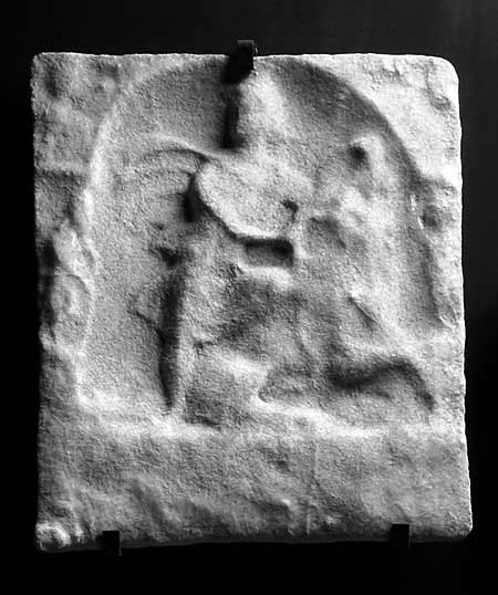 - Mythos: Mithras. Stiertötung (Tauroktonie) mit Cautopates links und Sol und Luna in den Zwickeln über dem Bogen, der die Szene rahmt.