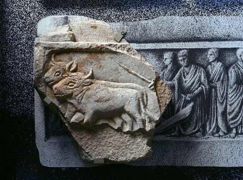 - Oben Rest eines Inschriftfeldes (?) mit Säulenrahmung. darunter rechteckiges Bildfeld mit nach links gehendem Ochsengespann. Rechts Rest einer Hand, die einen Stock hält (sulcus primigenius ?).
