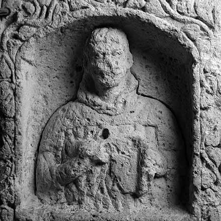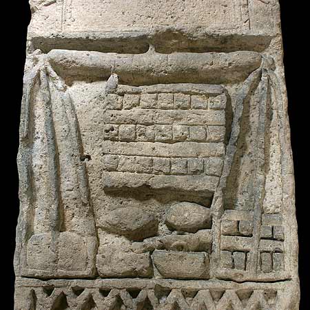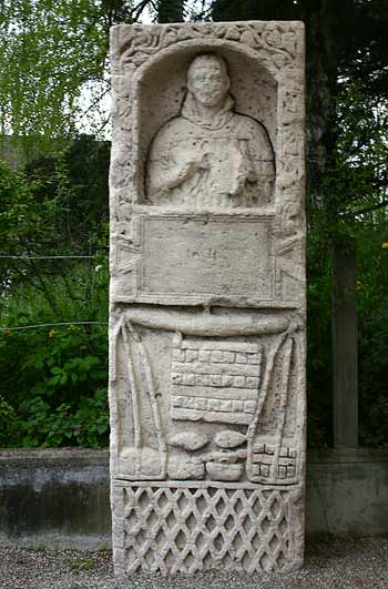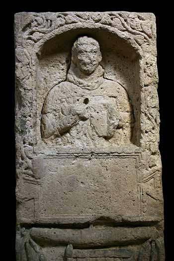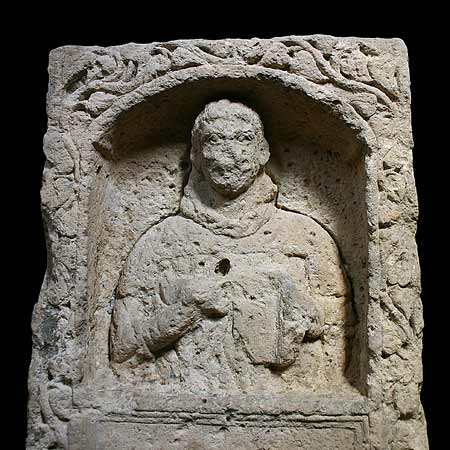 - In rundbogig geschlossener Nische, die von Efeuranke gerahmt wird, Halbfigur eines bartlosen Mannes in Paenula mit Kapuze, in den Händen eine Schreibtafel. Unterhalb der Porträtnische leere tabula ansata für die Grabinschrift. Darunter Bildfeld mit Waage. In der linken Schale Gewicht, in der rechten Eisenbarren (?). Zwischen den Waagschalen weitere Gewichte und ovale Eisenbarren, darüber eine Packung von Eisenbarren (?). Unter dem Bildfeld Rautengitter.
