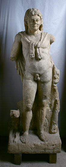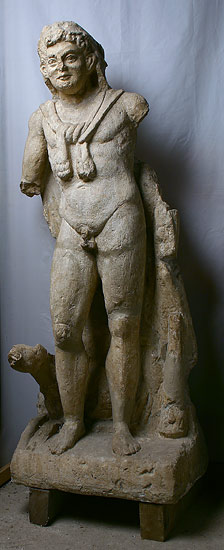 - Mythische Figur : auf rechteckiger flacher Sockelplatte stehender jugendlicher Herakles (Hercules), Löwenfell über Schultern und Rücken, Löwenkopf über den Kopf gezogen. Die Linke lag auf der Keule, neben und hinter dem rechten Bein liegender Kerberos (Cerberus).