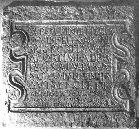 - Apollini et Hygiae / Q(uintus) Ulp(ius) Felix Aug(ustalis) m(unicipii) / Brig(etionis) porticum / a portis II ad fon/tem Salutis a / solo inpendis / suis fecit et / ad epulas privileg(io) colleg(ium) centon(ariorum) / haberi iussit praef(ecto) Iul(io) Sab(ino) / q(uin)q(uennale) Pr(a)esente et Extric(ato) co(n)s(ulibus) Noni(s) No(vembribus)