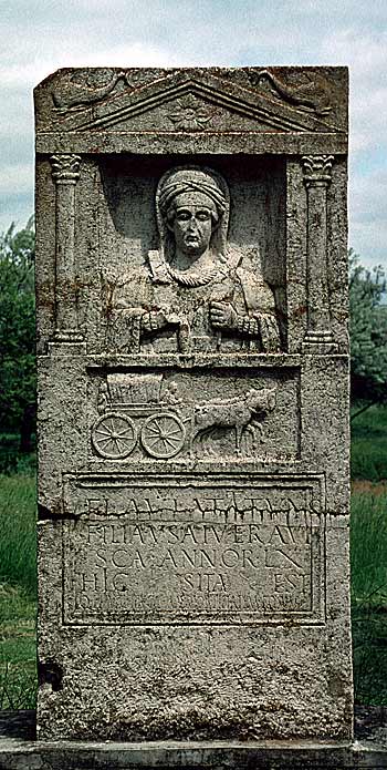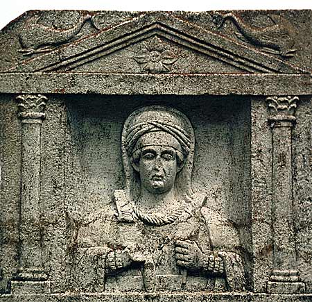 Im Hauptbild zwischen Säulen Rechtecknische mit Brustbild einer einheimischen Frau: Haube, Schleier, Umhang, Fibeln, Torques, Armbänder, in den Händen Spindel (?).