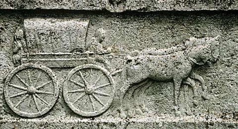 Im Zwischenbild Wagenszene: vierrädriger Planwagen mit Kutscher und Zweigespann, rückwärts sitzende Dienerin. - Inschrift