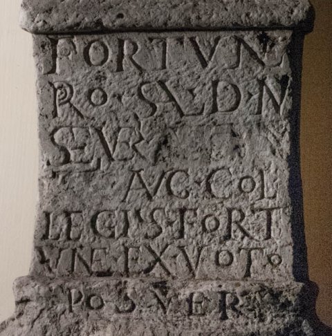 - Fortun(a)e pro sal(ute) d(omini) n(ostri) / Severi [[Alexan]]/[[dr]]i Aug(usti) col/legius(!) Fort/un(a)e ex voto posuer(unt)